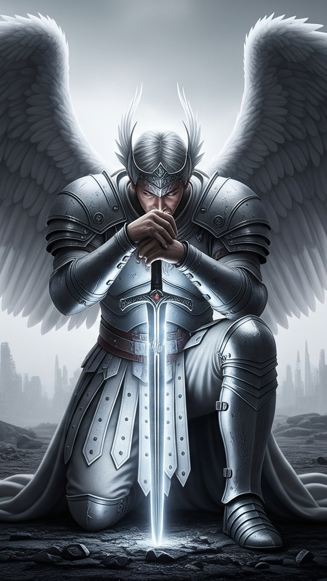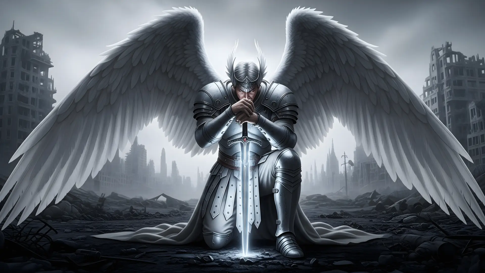 A warrior angel in silver armour kneeling on the ground holding his sword. A ruined city crumbles behind him.