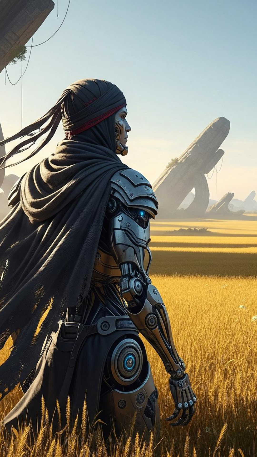 A cybernetic warrior gazes out over crop fields strewn with stone momuments