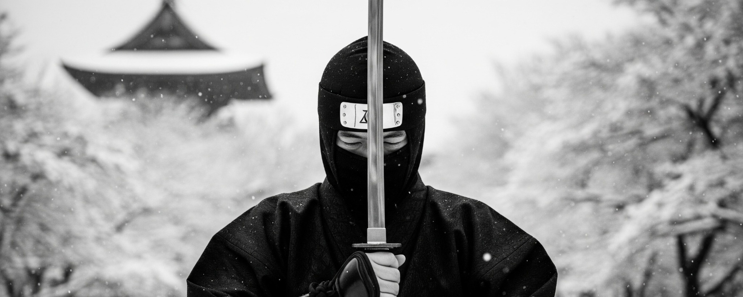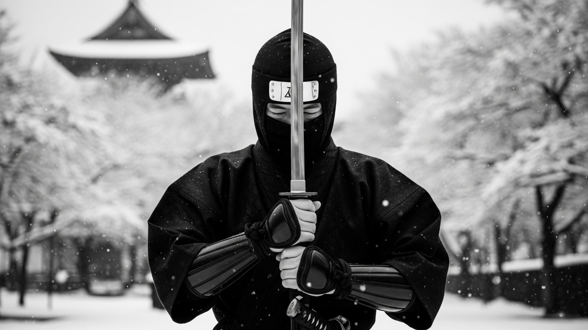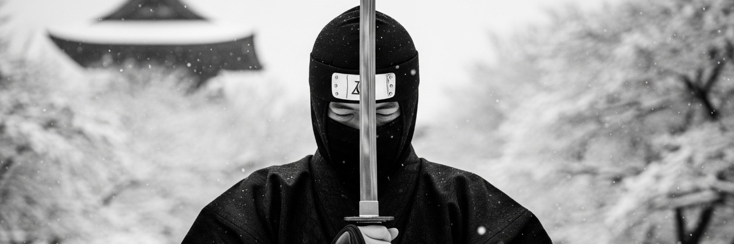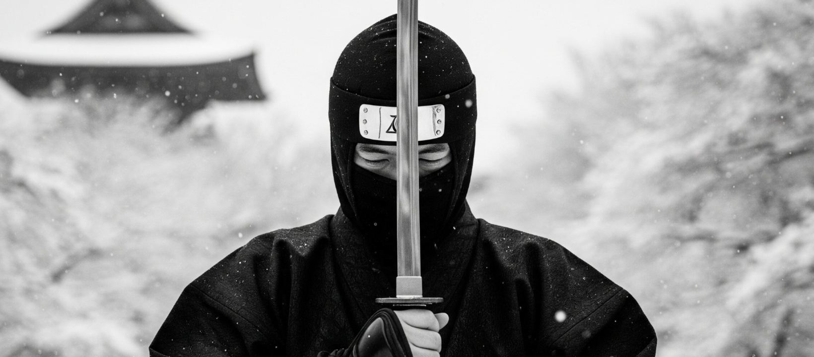 A solitary Japanese ninja stands in silent contemplation against a stark, winter landscape. The contrast of traditional warrior and desolate setting creates a mood of quiet strength and impending conflict.