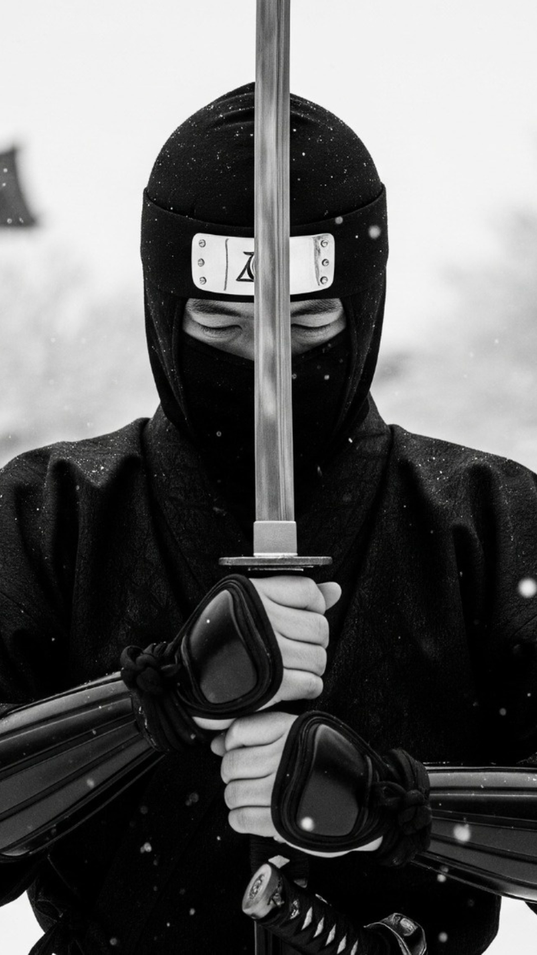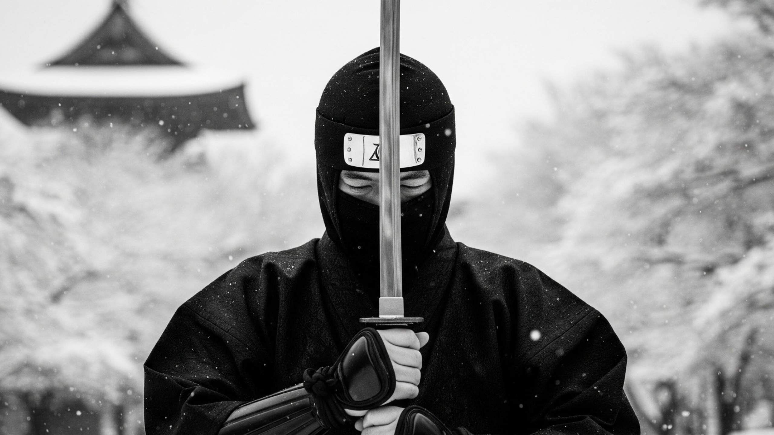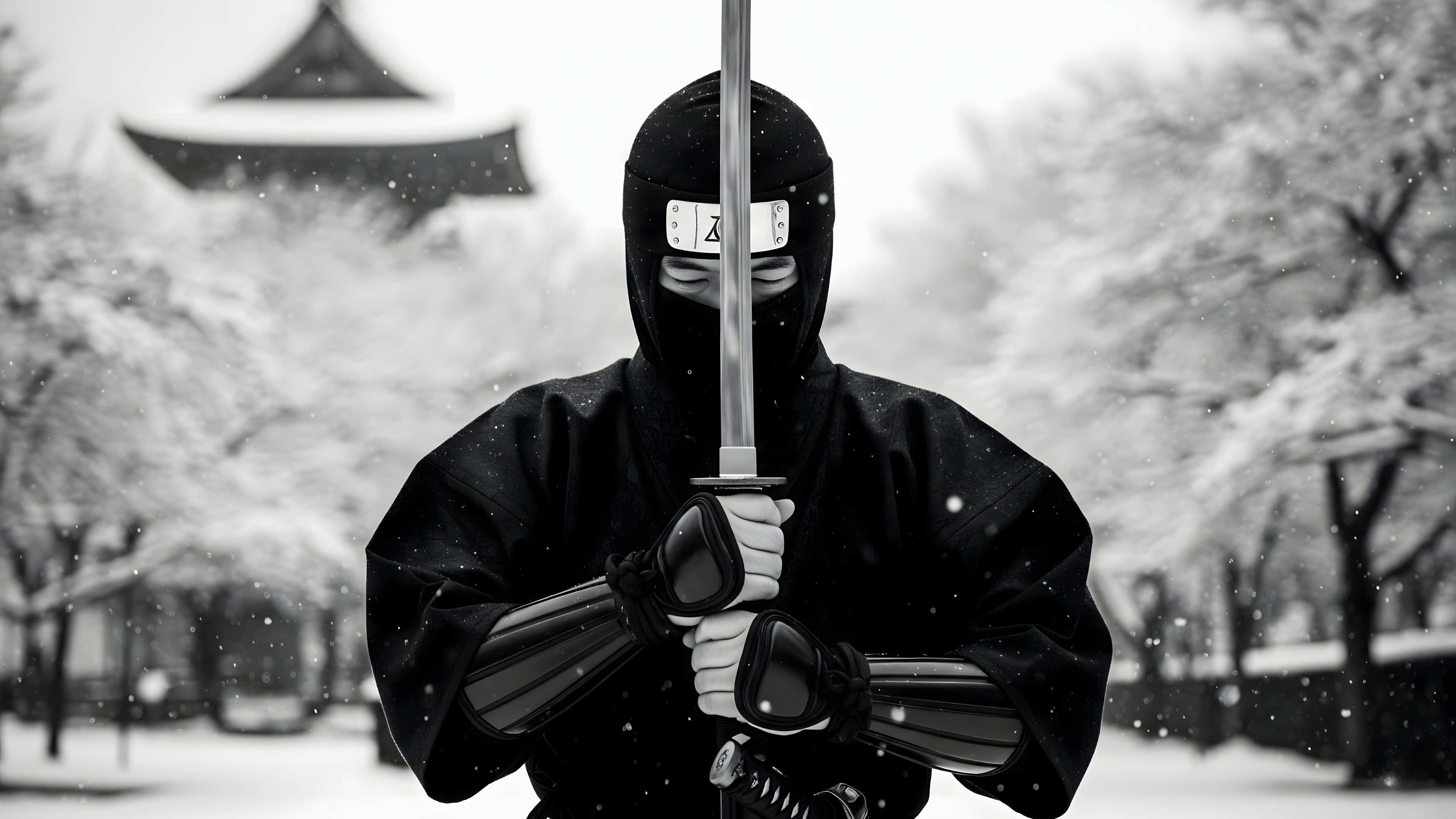A solitary Japanese ninja stands in silent contemplation against a stark, winter landscape. The contrast of traditional warrior and desolate setting creates a mood of quiet strength and impending conflict.
