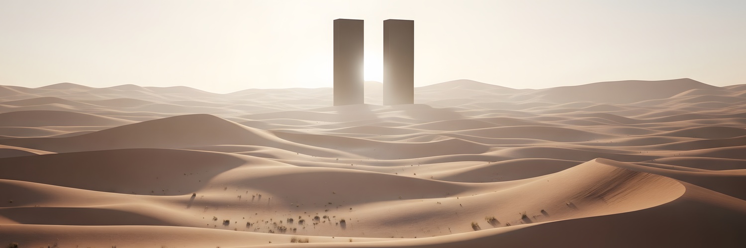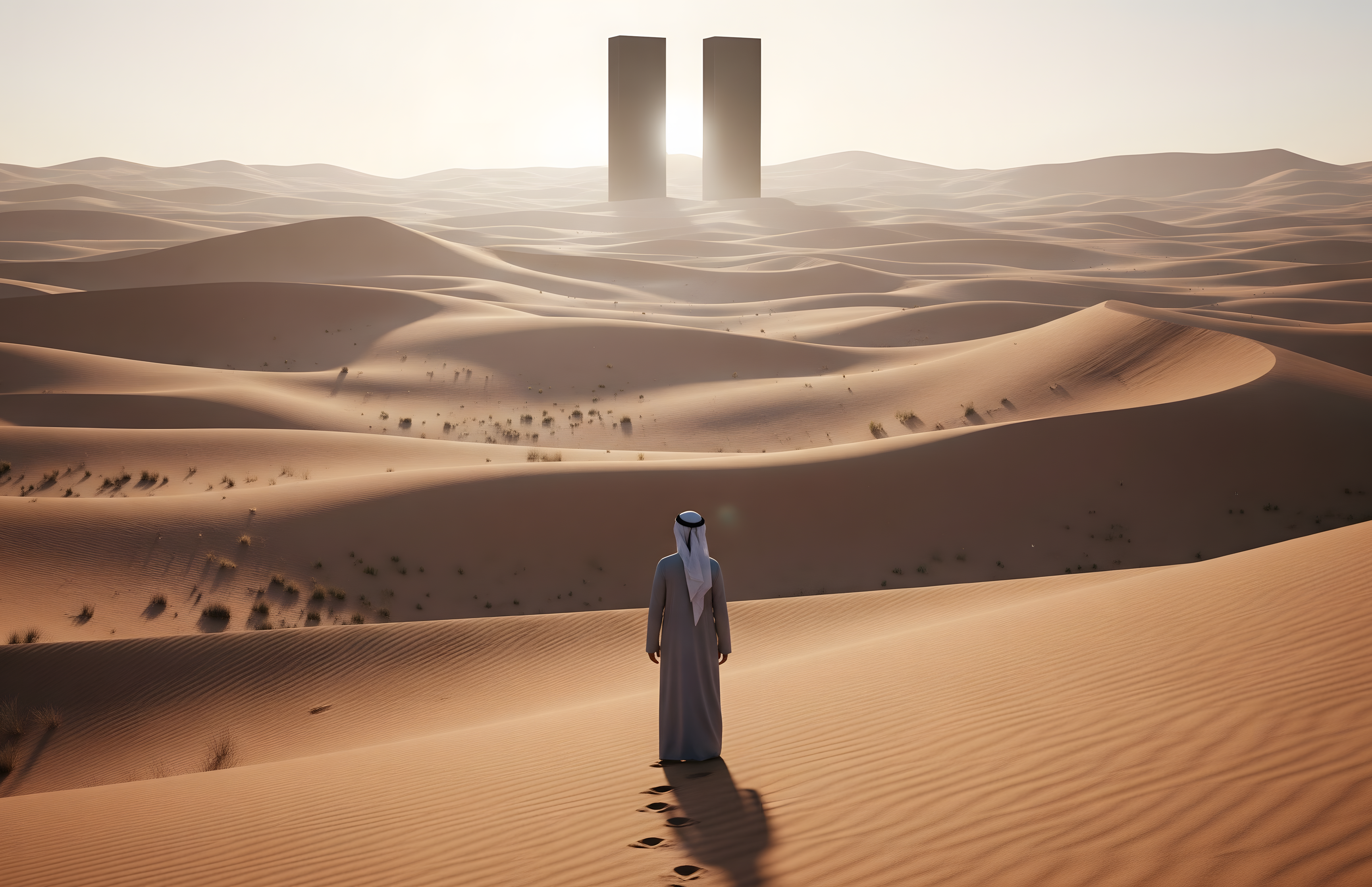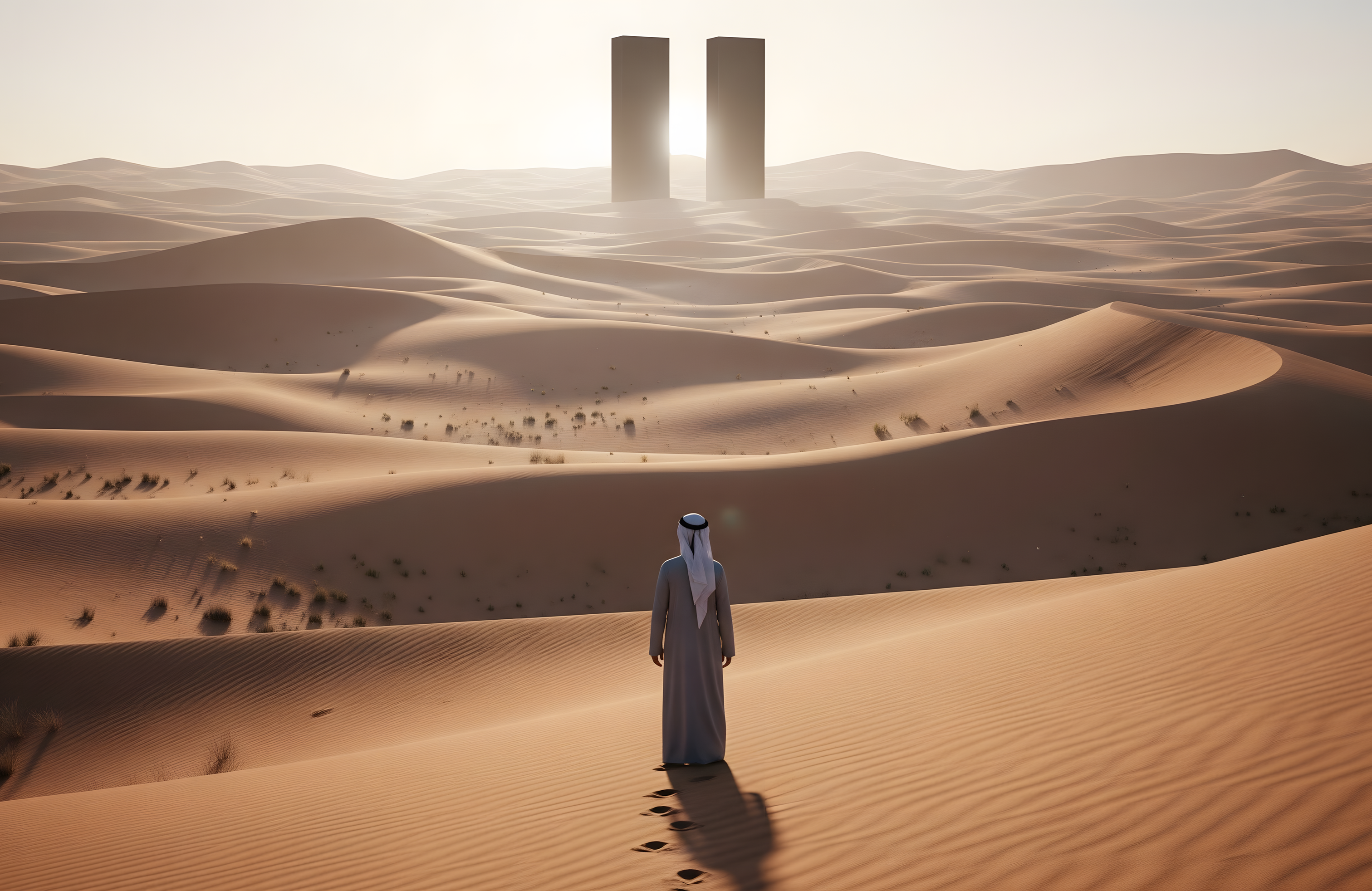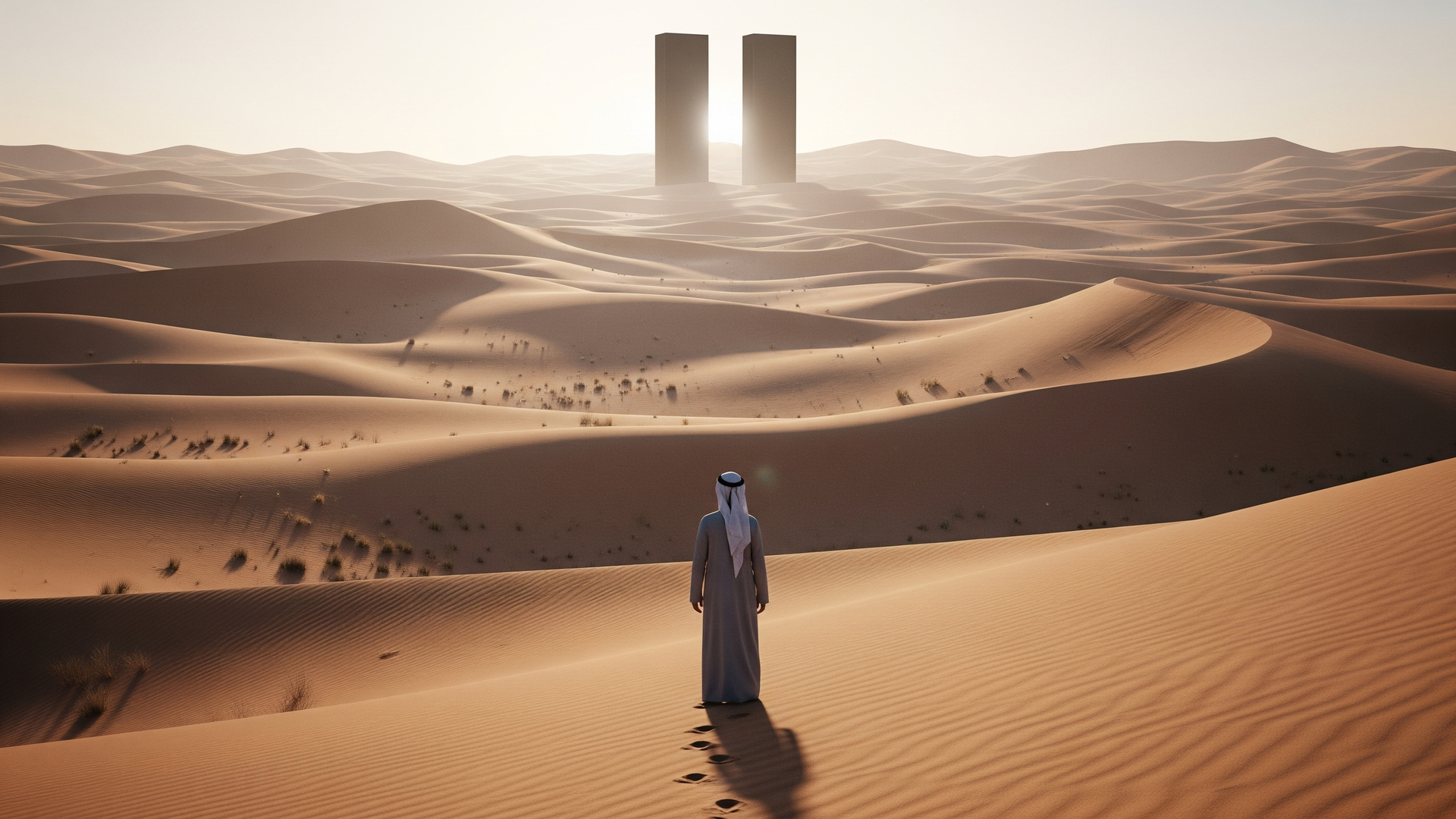 A lone figure surveys a sun-baked desert landscape dominated by two imposing black monoliths in the distance. A sense of mystery and isolation pervades this futuristic, possibly dystopian, scene.