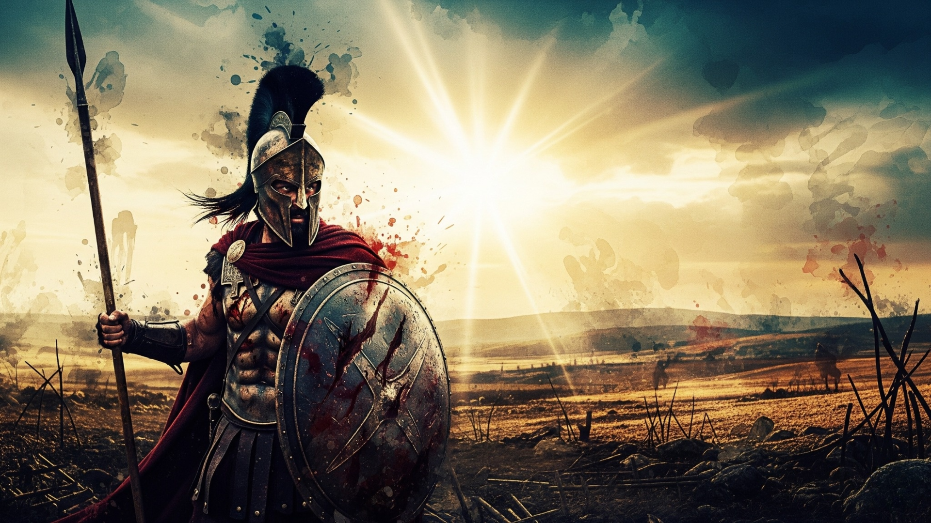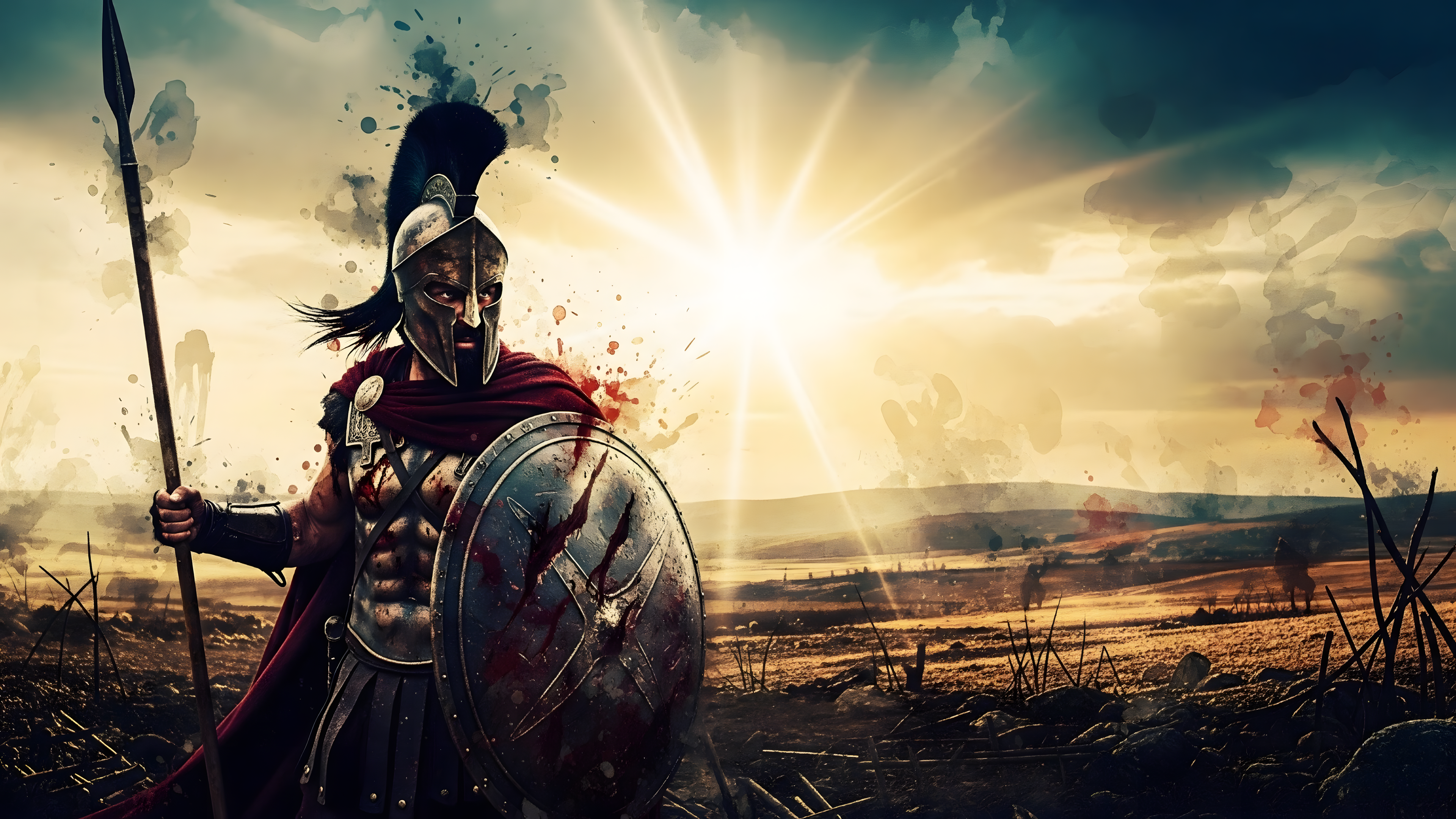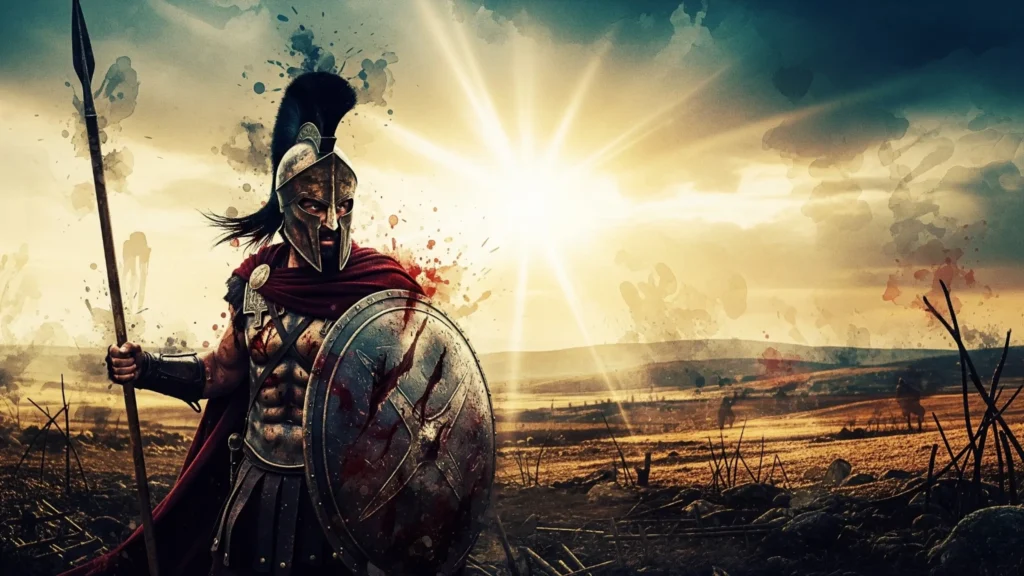 A stylized image a Spartan warrior, reminiscent of the 300 film aesthetic, standing in a field. The image blends classical warrior imagery with a modern style.